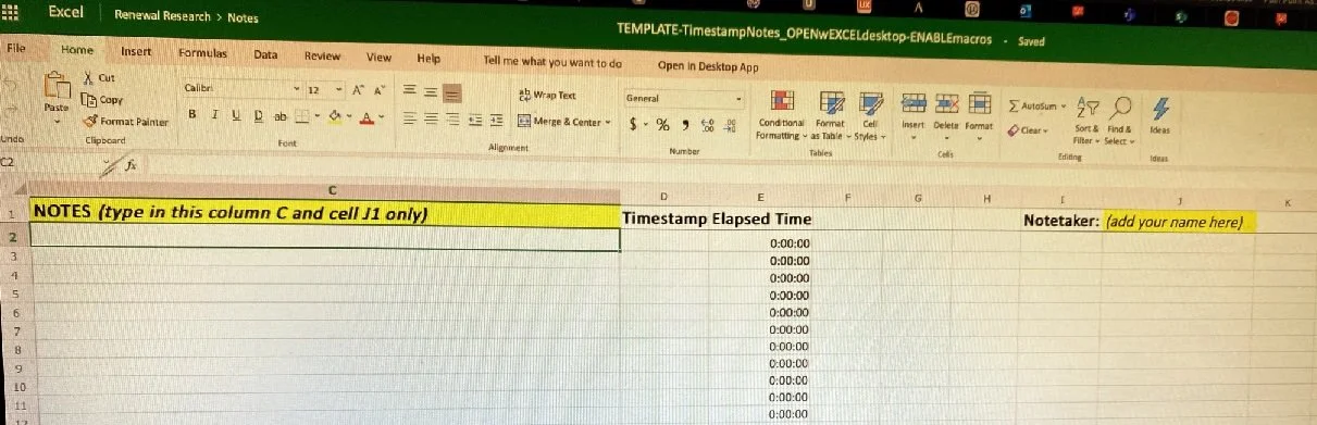 While all this was happening, designers and product managers were observing in the background, with their video off. I had a colleague take notes using the time-stamp template I created in Excel (training them ahead of time on note taking best practices, such as typing word for word as much as possible, and documenting participant behaviors):